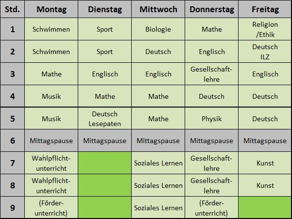 Dienstags endet der Unterricht nach der 5. Stunde. Danach finden Konferenzen der Lehrkräfte statt. |